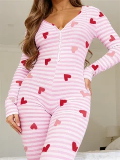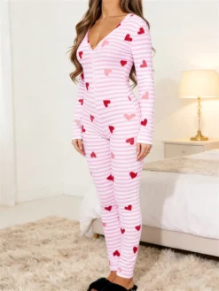 Womens Heart Printed Lounge Jumpsuits Button Up V Neck Long Sleeve Bodycon Romper Overalls for Daily Life Valentine’s Day
