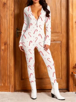 Christmas Women’s Jumpsuit Pajamas Long Sleeve V Neck Themed Print Bodysuit Sleepwear with Drop Seat Butt Flap